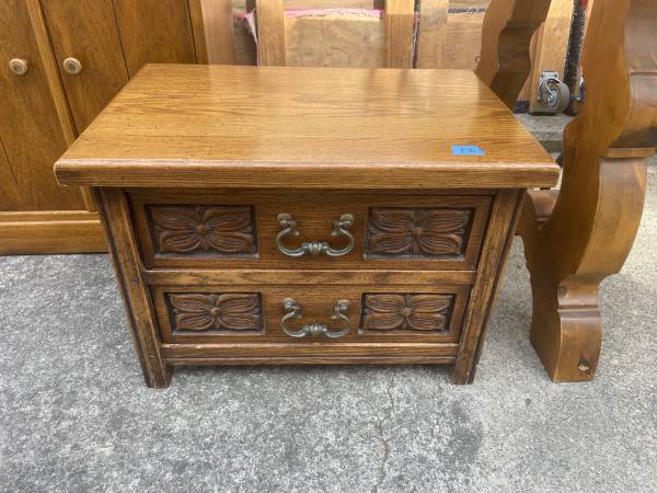 Brandt two drawer chest, antique oak, carved front, Vintage and Excellent Condition, 23"w x 15"d x 16"h - $60