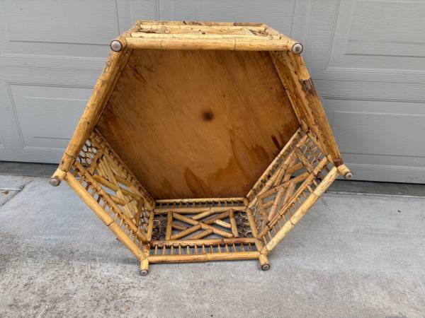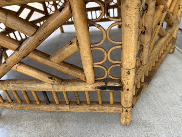 Good vintage condition. Some color loss to rattan finish. Soiling on the top surface (cane is laid down over plywood). No visible breaks. Sturdy.