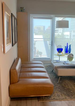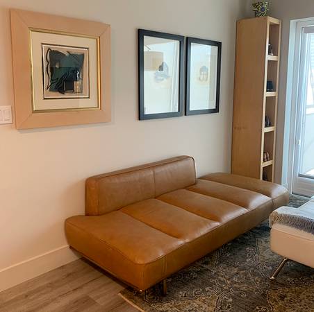 Exceptionally clean, like-new daybed/sofa from CB2’s Lawndale collection. Upholstered in rich saddle‑brown leather, it sits on a sleek brass (or metal) base. The styling strikes a balance between modern elegance and casual comfort. Can work as a sofa or a lounging daybed depending on your layout.