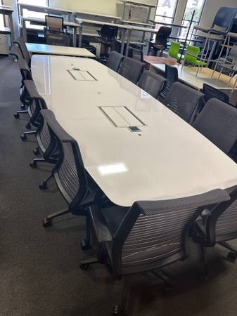 Used 12' and 9' Boat shape conference room tables with whiteboard material surface. Yes, you read that right. You can write on these conference room tables with whiteboard markers.