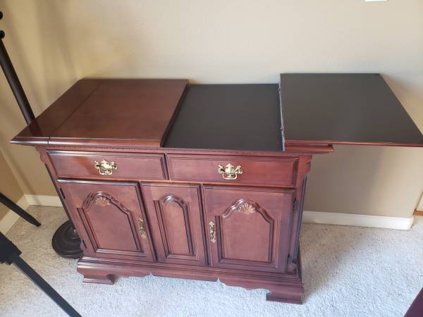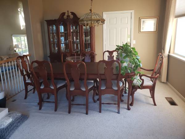 Thomasville Lexington Cherry Dining Room set. Hutch, lighted china cabinet, dining room table (w/ table pad), 6 side chairs, 2 arm chairs, and a folding-top mobile server. All a set. Bought directly from North Carolina. Perfect condition. Happy to show first. In person only.
