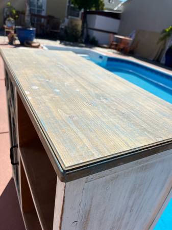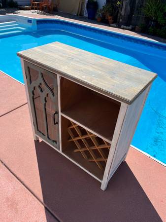 Wine bar in excellent condition, like new Holds 12 bottles of wine. Distressed wood, great accent piece Measures approx 32" Width 32" Height 15" Depth Can deliver within reasonable distance Call or...