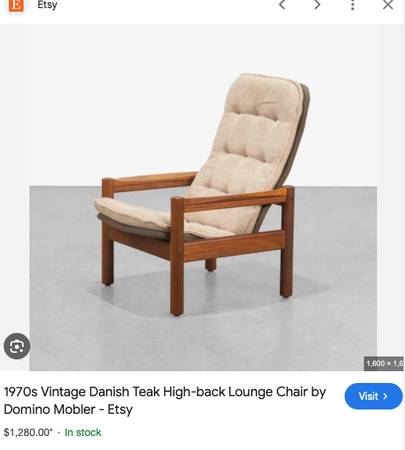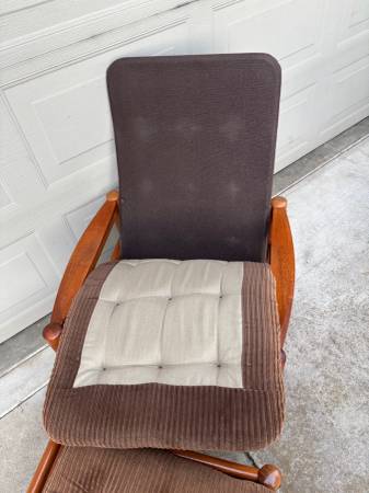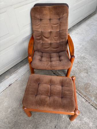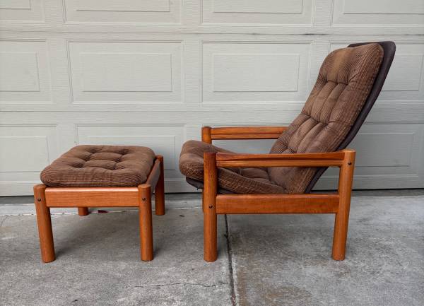 Vintage Domino Mobler Danish Modern teak lounge chair and ottoman. Solid wood construction. Well made. Attached brown corduroy upholstered cushions. (Seat cushion is attached to chair frame at bottom). Sling canvas support. Ottoman cushion removable and ottoman could be used as a table. Label on underside of chair. Chair is slightly reclined (does not recline further). Compare at $1500.00+