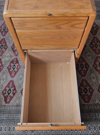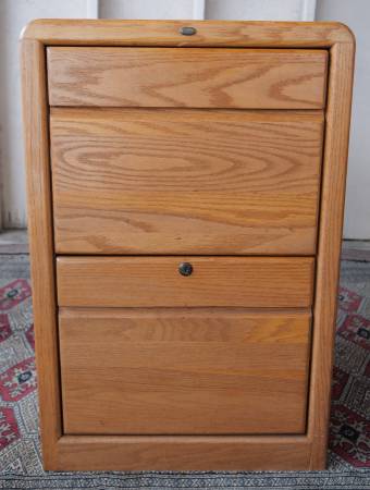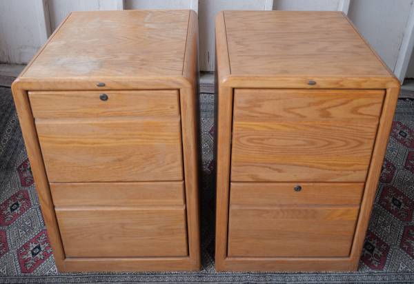 For sale is a genuine oak wood two-drawer short file cabinet. I actually have two (2) of these cabinets. They are perfectly identical in terms of brand, model, size, and construction. But one of them has a small cosmetic issue that is described below. The first cabinet is shown in Pictures 3 to 22. The top side of the second cabinet is shown in Pictures 23 and 24.