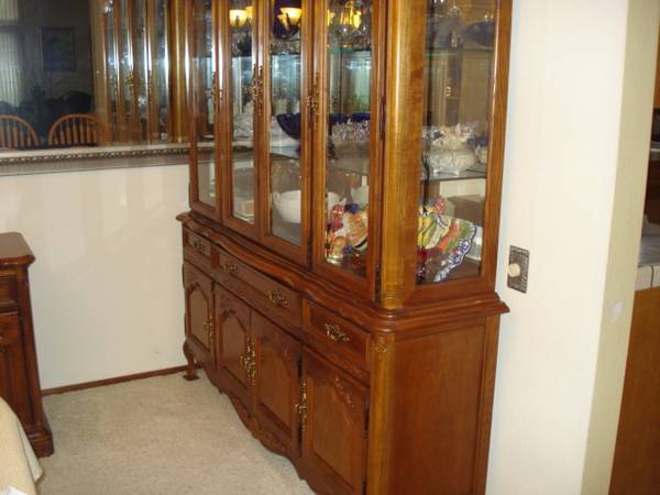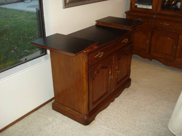 Rectangular leg Banquet Table with two drawers, two leaves extend table to 124" length, table pad, two arm chairs, six chairs back, total of eight chairs, hutch, server one drawer and shelf behind two doors, foldout top.