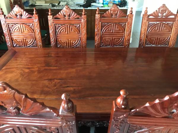 Grand Solid Wood Dining Room Set Made in Vietnam/Imported from Vietnam 10 Wooden Chairs Heavy Duty Beautiful Warm Wood Ornate Carvings Design Solid Wood $1,000 or Best Offer takes it!
