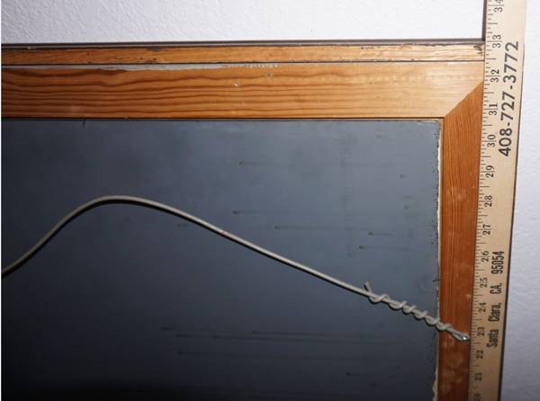 Rigged with heavy-duty picture wire that's strung for portrait mode. (You could restring it to landscape mode to fit your space.)
