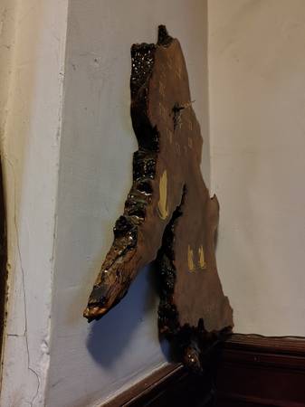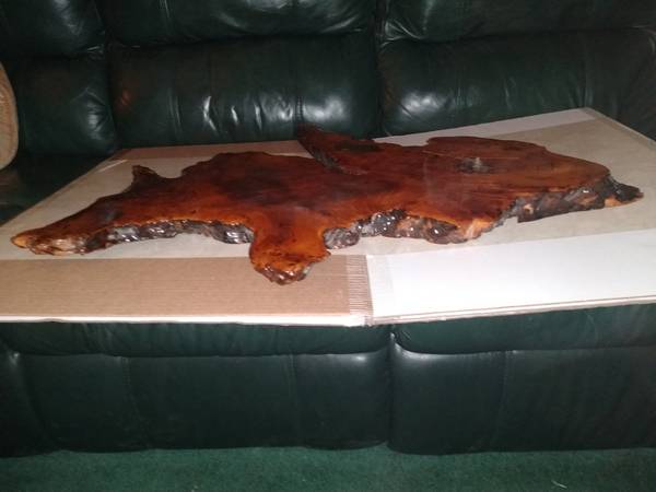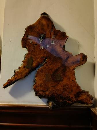 LARGE BURL WOOD CLOCK ( CLOCK DOES WORK) WITH GOLD PRAYING HANDS & TWO GOLD SWANS AND THE LETTERS ON THE BOTTOM EZ2BME CLOCK MEASURES 30" X 26" WIDE & 1 1/2" THICK $200.00
