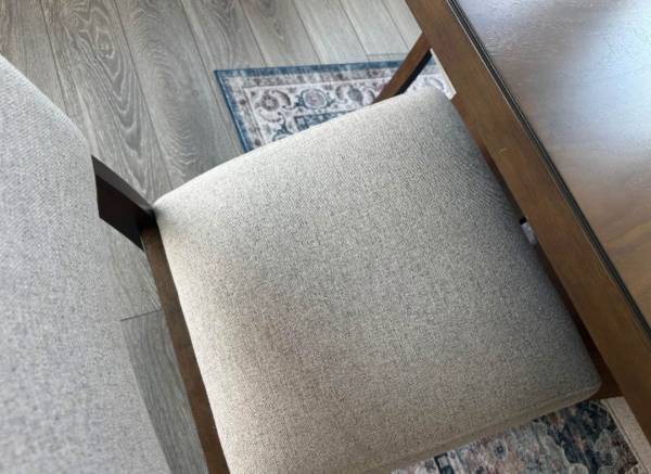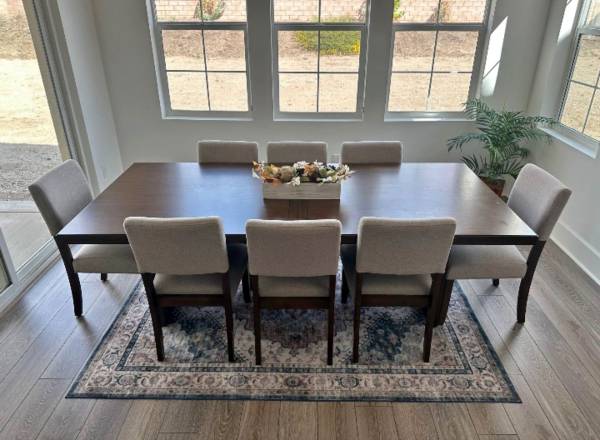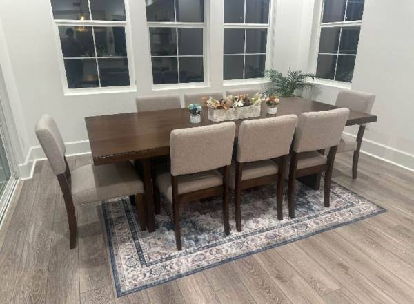 Like new wooden dining table with eight chairs in excellent condition. Can be extended. 92”L x 42” W x 30” H Extended: 108” L x 42 x 30