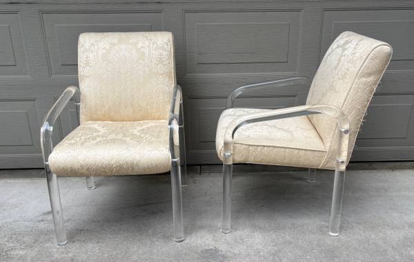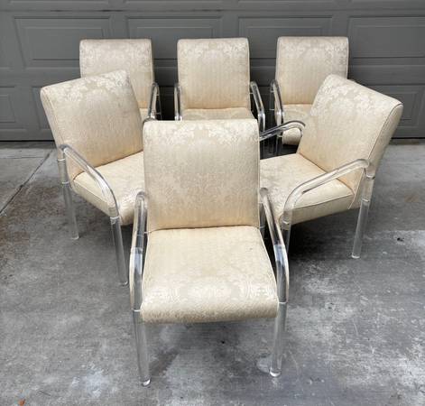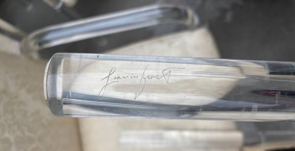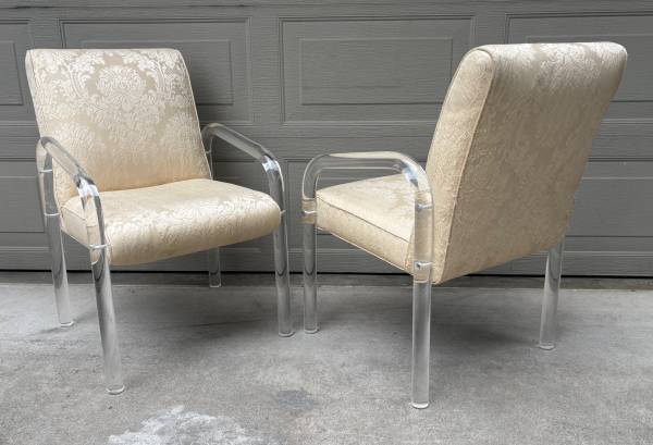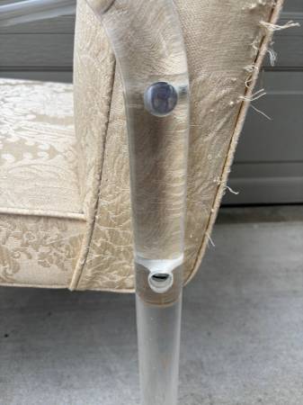 The lucite is in very good condition with a few scuffs, no chips, stress fractures or repairs. Several of the brushed steel/aluminum caps that cover the bolts are missing. Upholstery appears to be original and will need replacing.