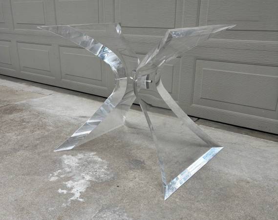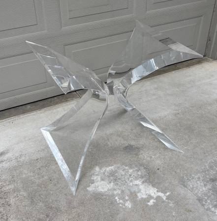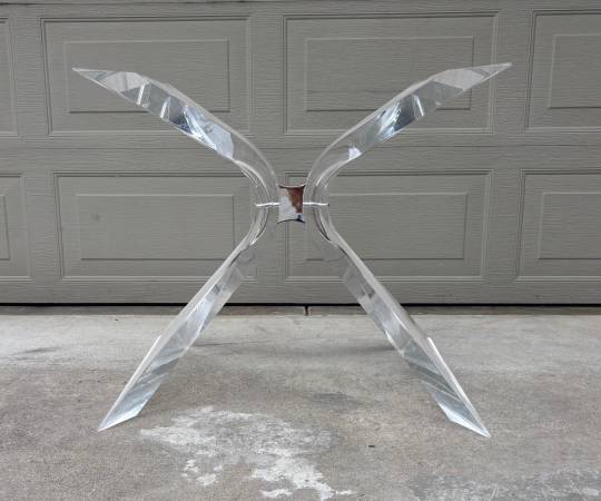 Classic Lion in Frost (Leon Frost) lucite / Acrylic "bowtie" dining table base (original rounded-edged rectangular glass top included if buyer wants it) I have the 6 matching tubular dining arm chairs in another listing. Etched signature on the base. Chrome finish metal center accent. Last phot shows close-up of the table top. Beveled edged glass top is in very good condition with no chips, some light surface scotches/abrasions.
