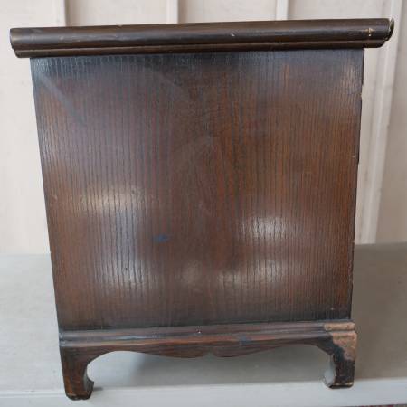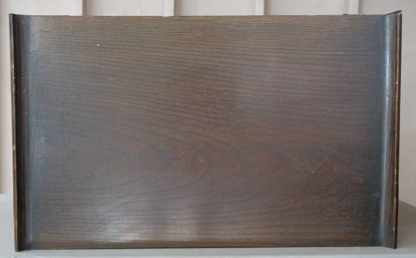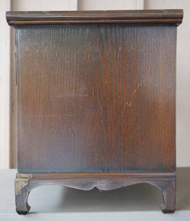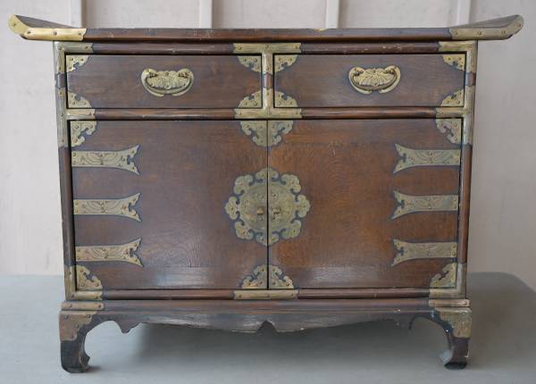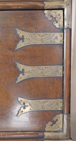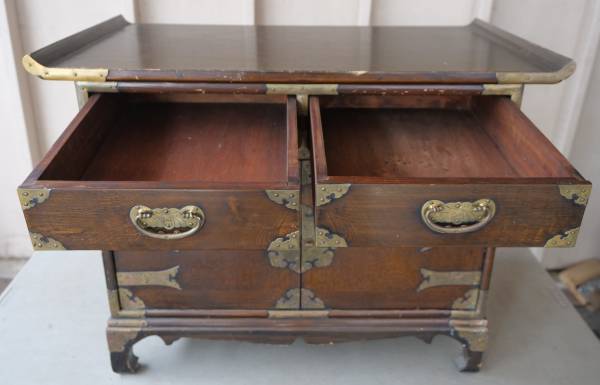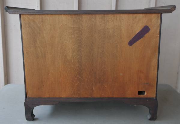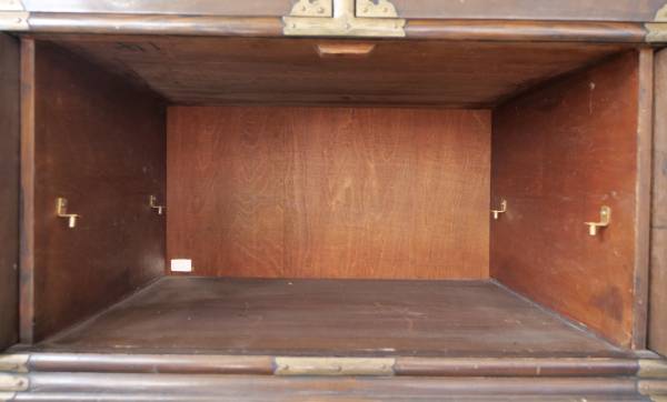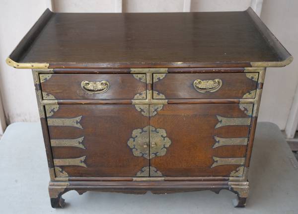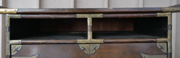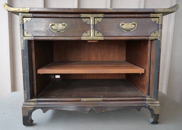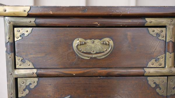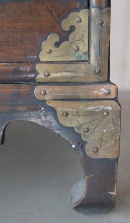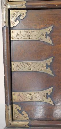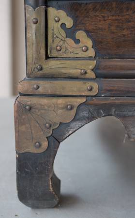The cabinet is very reminiscent of a Meiji-era furniture piece with lots of simple square lines, along with lots of decorative metal elements. The only non-linear elements are the edges of the top surface, which slightly curve upward, and the four tiny feet, which curve inwards.