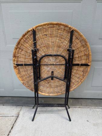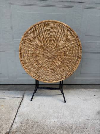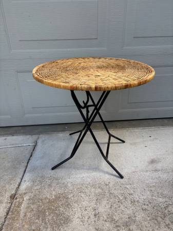 Nice vintage mid century modern wicker / rattan round top side or end patio table. Folds vertically to save space and can stand alone like a tilt top table. Wicker in remarkably good condition with only a couple possible breaks. Folding mechanism works well.