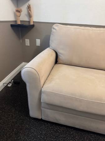 It is microsuede, off white/ vanilla color, barely used, super soft, clean and extremely comfortable.
