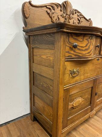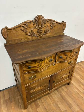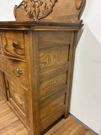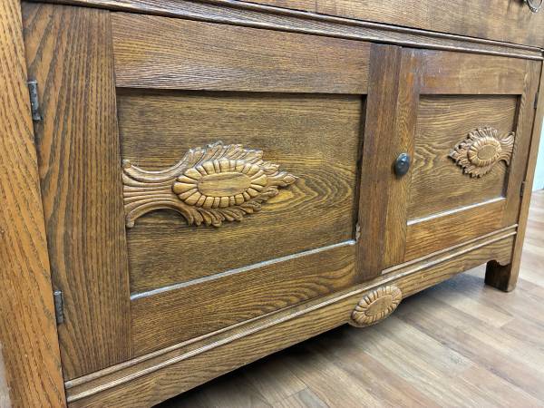 This stunning carved wood dresser features five spacious drawers with mixed metal hardware, intricate detailing on the top backboard and drawer fronts, and a rich brown finish. A true vintage gem that blends elegance with functionalityβperfect for bedrooms, entryways, or boutique-style interiors.
