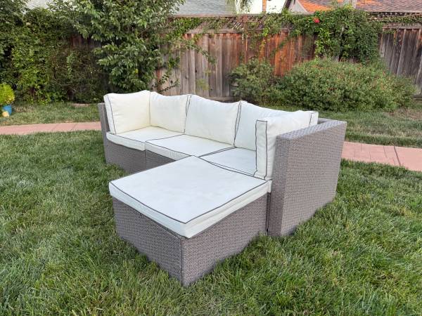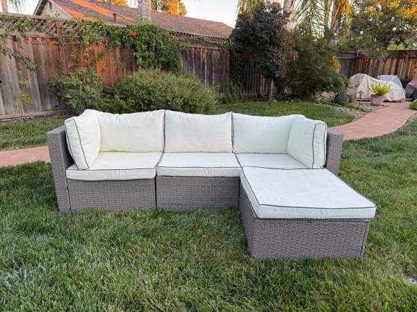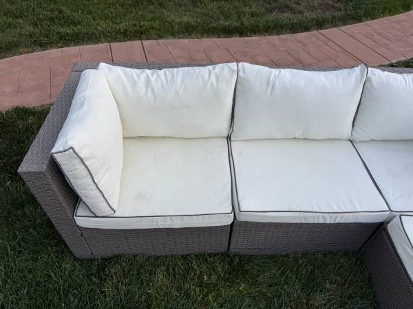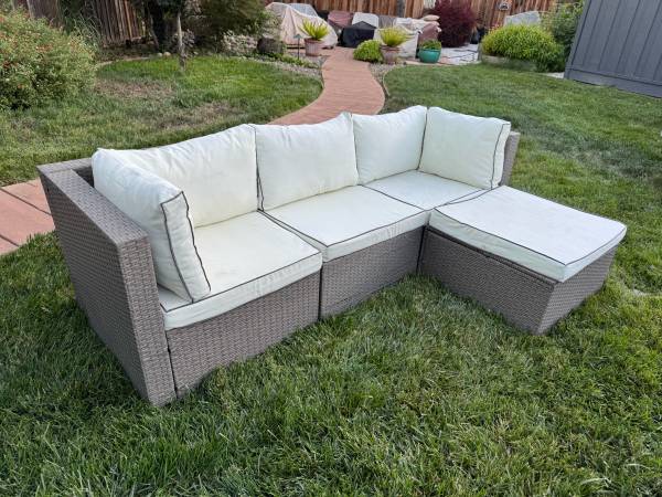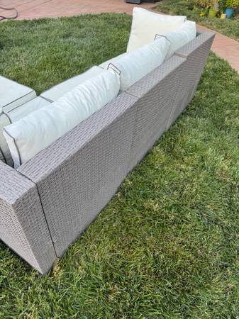Used in good condition. There is some staining on the cushions, but they all have zippers for easy removal for washing. We can offer local delivery for an additional fee.