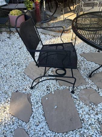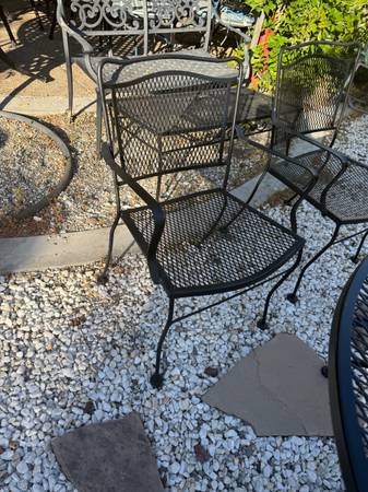 Oval table measures 60” by 38” with center umbrella hole 5 armchairs , (3 are rocking and 2 are stationary) Made of wrought iron Just spray painted Woodard Salterini collection