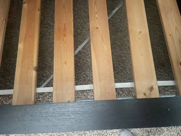 Queen bed frame, black FREE. Good condition. See pics. Mattress not included. Mattress or box spring sits on slats, surrounded by the bed frame. See pics Headboard 30.5” high Outside of frame is 67”...