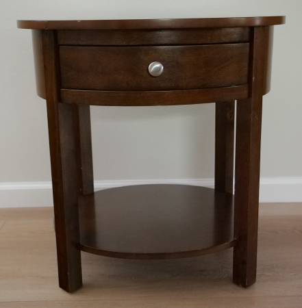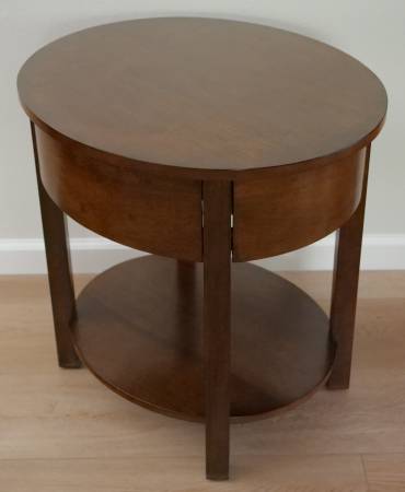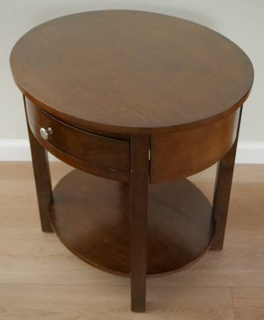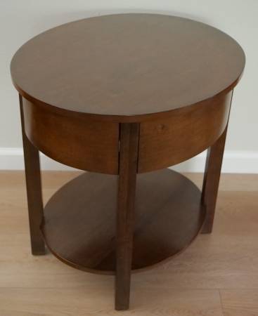 This is an oval-shaped end table with a single drawer and bottom open shelf. The entire unit measures 24.25" wide, 21.25" deep, and 24.25" tall. The interior space of the drawer, which rests on wooden sliders, measures 12.25" wide, 10.5" deep at the edges, 12.25" deep in the middle, and 2.75" tall. Below the drawer is an open space that measures 20.75" wide, 17.5" deep, and 13" tall. The space at the very bottom of the table, where the legs are, measures 4.25" tall.