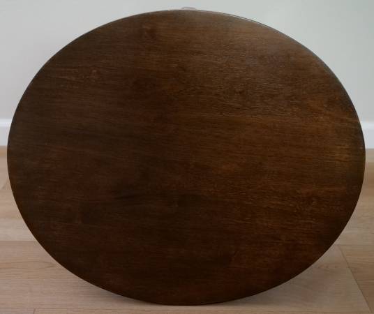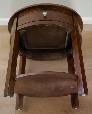 The table is in like-new condition. Structurally, it's in incredibly robust condition, with no wood bending, warping, or fatigue. The drawer slides out with ease. Everything is solid. Cosmetically, everything is also in like-new condition. There are no significant scratches, dents, dings, or smudges or any exterior surface.