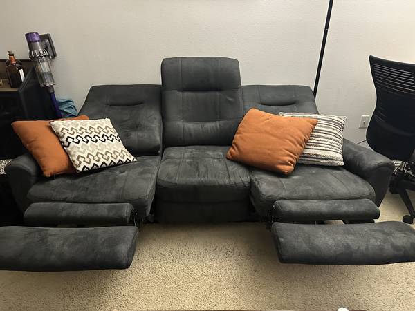 Bought from Living Spaces — original price $1,500. Comfortable grey 3-seater sofa with two electric recliners on the ends. Soft fabric, smooth reclining, and good overall condition. Note: The left...