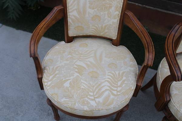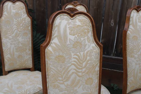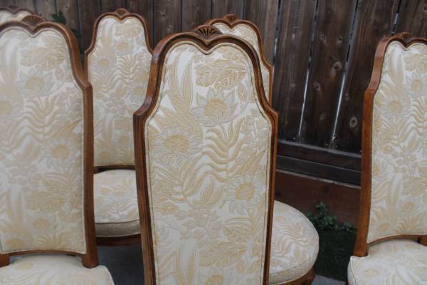 Set of 8. 6 Regular and 2 Arm Chairs. Vintage Mid Century Dining Kitchen Chairs. Light yellow and wood. Beautiful chairs! See pictures for details. Unique and great statement pieces.