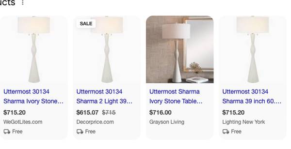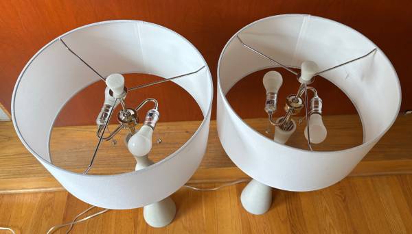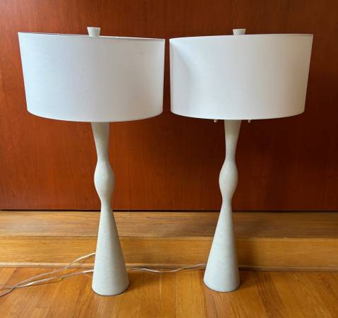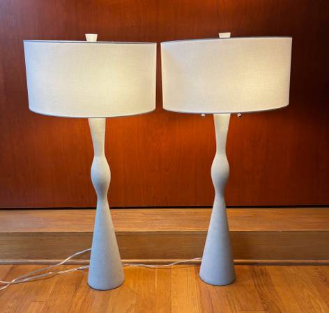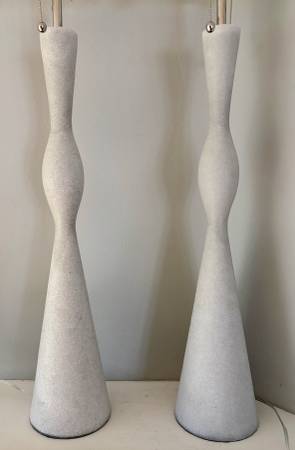 Nice pair of Uttermost "Sharma" man made ivory stone (actually a light grayish color) modern table lamps. Tall, sculptural organic vase shaped lamps with chrome hardware and matching man made stone finials. Both lamps have two sockets each with on/off pull chains. Lamp shades included. Compare at $750+ each