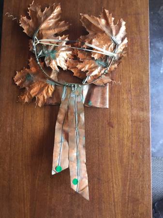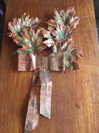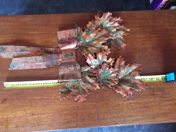 This vintage copper metal oak maple leaf wall decoration sculpture is a beautiful addition to any room in your home. The medium-sized sculpture features a Bow Ribbon shape with leaves, perfect for nature lovers or those who appreciate vintage decor. Made of shiny copper metal, the piece adds a touch of retro style to your space with its unique design. No additional parts are required for mounting, making it easy to display in any room. Made in the United States, this sculpture is one piece. Measures 23 inches long, 14 inches wide. From Smoke free home.