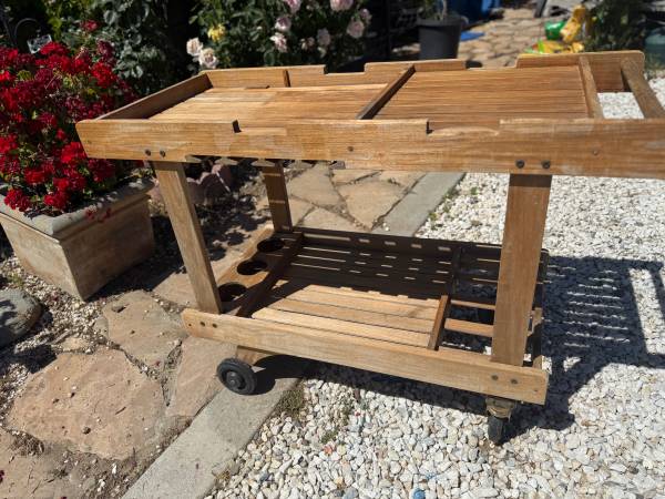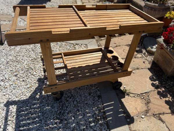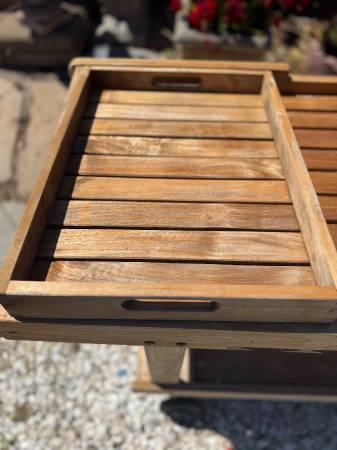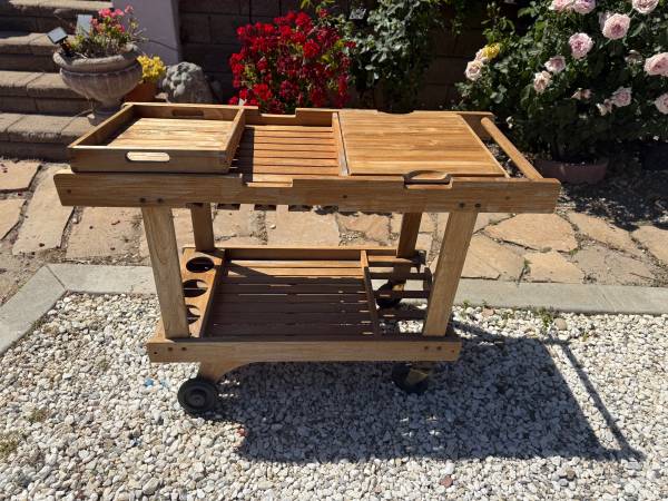 Large Teak Wood Drink Cart, with removable teak tray and teak cutting board. Brass hardware and on wheels to move around easily. measures 48" by 21" by 33" H Patio furniture, garden furniture
