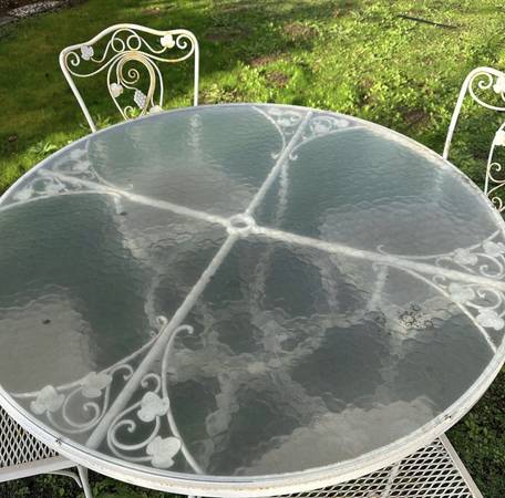 Vintage patio set Grape and leaf pattern Glass top, measures 42” in diameter MCM Outdoor furniture