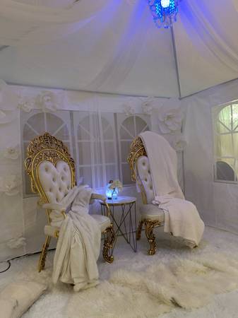 Featuring tufted upholstery, ornate gold detailing, and a luxurious high-back design