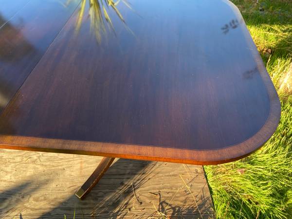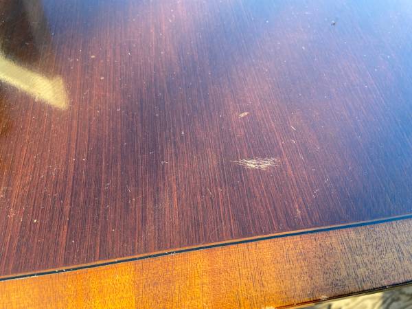 Top has some surface scuffs and marks and could use a new gloss refinish see pictures for details comes with covers and 3 leafs there is some dings and scuffs on the legs selling as is no returns eta 4-6 weeks