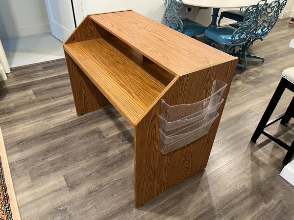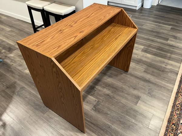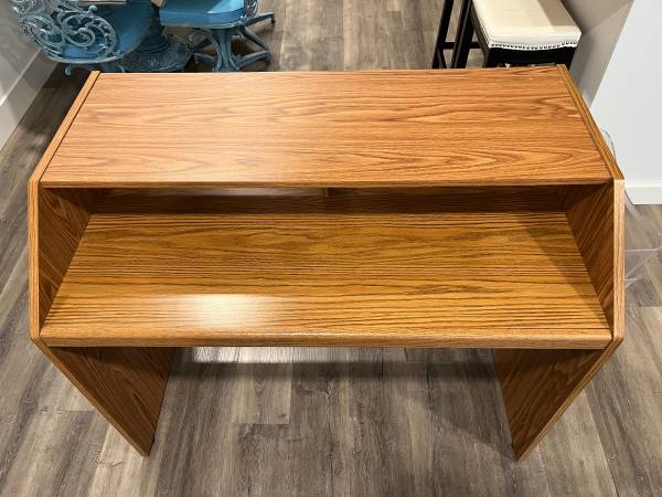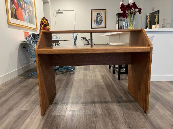 Desk in good condition with elevated shelf for monitors. Located in the Nuevo neighborhood. Height is 34 inches. Length is 43 inches. Depth is 23 3/4 inches.