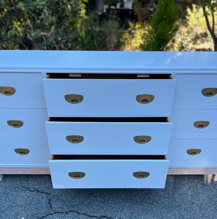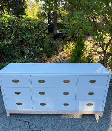 This stunning 9-drawer dresser is a true gem-made of solid oak with dovetailed drawers and freshly painted in Lamp White by Fusion Mineral for that crisp, classic glow. We finished it off with the original solid brass campaign style hardware cleaned and sprayed with gold leaf that strike just the right note of shine. Custom built solid red oak base stained in pickled oak and sealed with urethane. The wood inside the drawers/dresser nourished with beeswax.