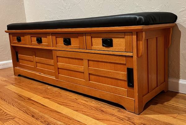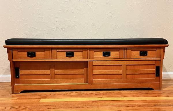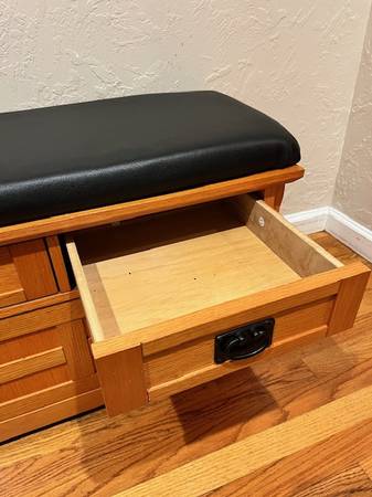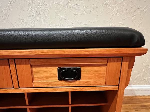 Selling our rustic, solid wood shoe storage bench with padded cushion and 4 drawers. We are about to remodel, so it needs to go. Otherwise, it's a beautiful piece of furniture, always gotten many compliments on it.