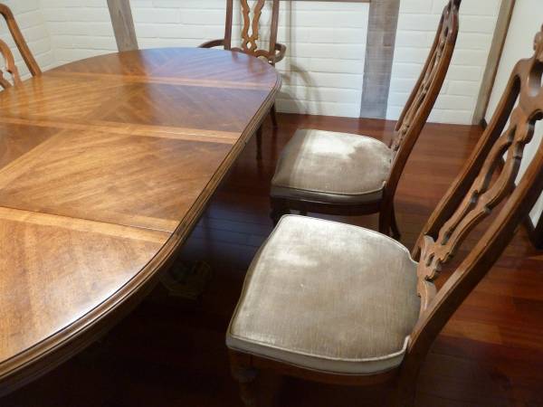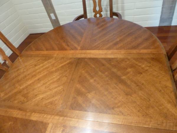 Drexel Estorada Dining Table. Very Good condition. 6 chairs- 2 arm chairs, 4 chairs without arms. Very well made. 2 18" leaves. Without leaves table is 44" round. With both leaves table is 44" x 80".
