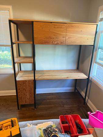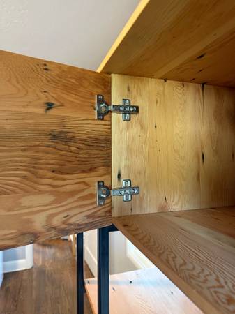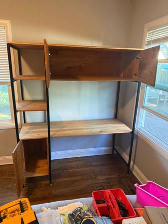 We had this desk custom made for us when we lived in Vancouver Canada by a wood shop. It is solid wood and metal natural reclaimed wood. One door on the top needs to be screwed in a little tighter but in excellent shape. We are so sad to part with this but we are moving and it doesn’t fit in our new place. Pick up/cash only. Text only show contact info