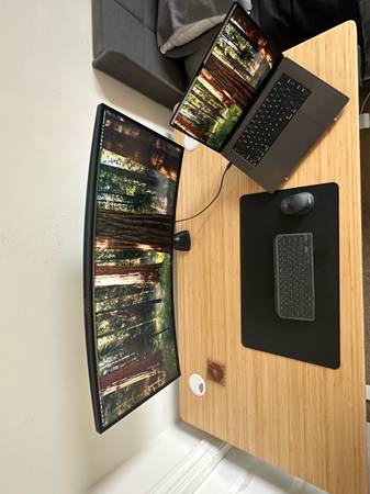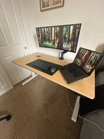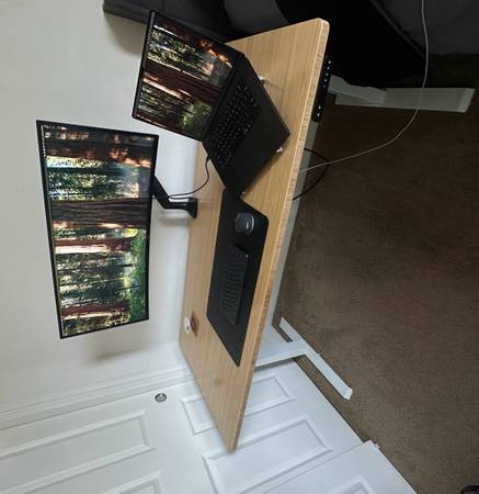 I’m selling everything you see in the picture (except laptop, mouse and keyboard) Vernal Standing desk: White bamboo 60” x 30” Dell ultra sharp wide 34 inches monitor Desk chair Monitor arm