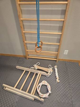 We absolutely love this climbing wall but my kid is a bit too big for it now. It came with 6 attachments: