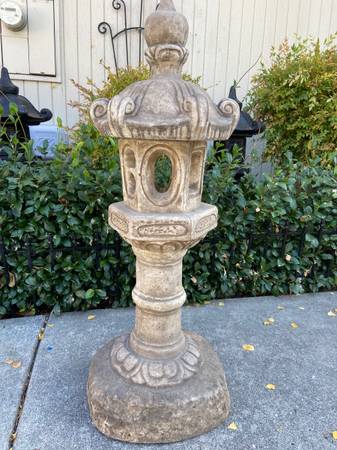 This is a very unique Asian/Chinese/Japanese concrete/cement garden lantern pagoda. It is 40 inches high 15 inches wide at the widest part of the base has a hole in the middle so you can hook it up to electricity. This would be a focus point of any zin garden. Comes in three pieces for easy transportation.