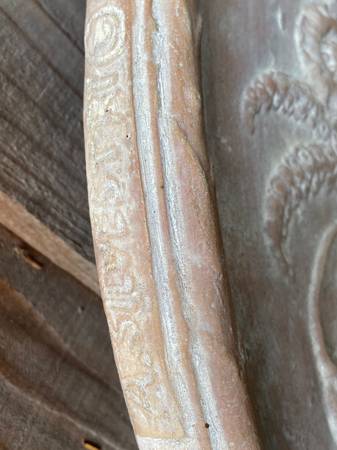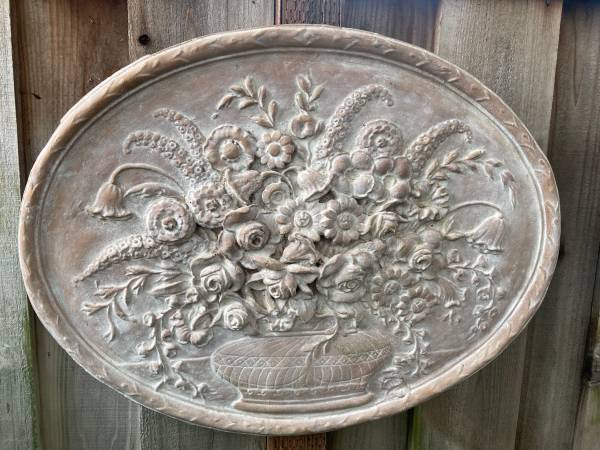 This is a very unique design it is a concrete/cement garden/ yard /patio floral wall plaque.This is a very heavy piece, would look great in any patio or home entryway. It is 29 inches across, 22 inches tall 2 inches deep.