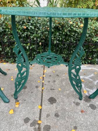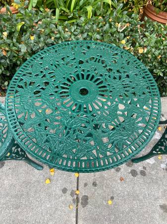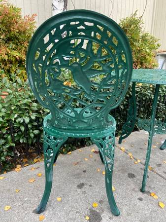 This is a cast aluminum patio table and chair, set. This would work great for any small setting, porch, deck or garden area. The chairs and table have a hummingbird theme.