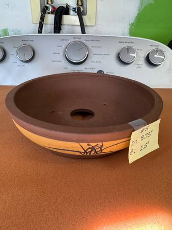 Item #5: brand new and extremely high quality, designed in round shape in brown and gold color. It has a very large drainage hole at the center and three more small holes for anchoring the bonsai tree. Dimension: diameter = 8.75", heigh = 2.50”. Asking $37