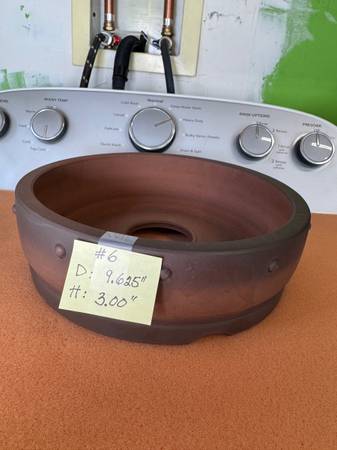 Item #6: brand new and extremely high quality, designed in round shape and drum style in brown color. It has a very large drainage hole at the center and three more small holes for anchoring the bonsai tree. Dimension: diameter = 9.625", heigh = 3.00”. Asking $43