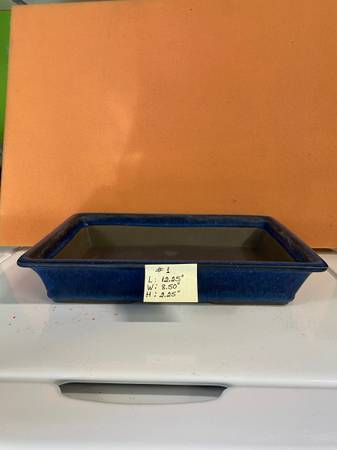 Item #1: Used reconditioned very high quality shallow rectangular blue bonsai pot designed with very low profile legs. Dimension: length = 12.25”; width = 8.50”; height = 2.25”. Asking $45