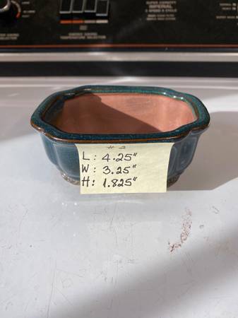 Item #1: Brand new blue color oval shape, it’s the highest quality you could obtain from bonsai pot made in Japan. Dimension: length = 5.00", width 3.50", height 1.75". I bought it from my trip to Japan. Asking price $30