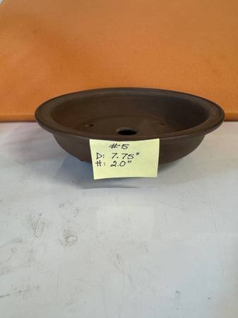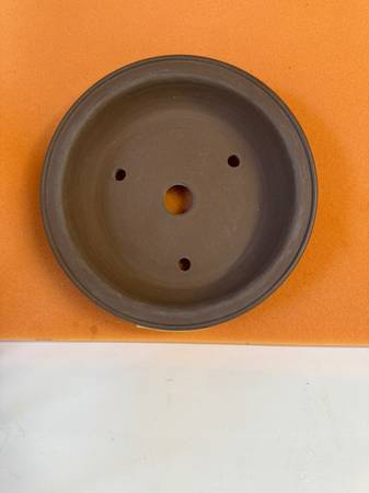 Item #5: Brown color round shape, very top highest quality bonsai pot made in Japan. It’s designed in very low profile legs, consists of one very large hole for drainage and addition three smaller holes for anchor the bonsai tree. Dimension: diameter = 7.75", height 2.0". Asking price $35