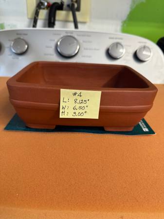 Item #4: Brand new high quality rectangular shape in brown color, with molding at the center line of the pot, and very low profile legs. It has two large draining holes, and 4 little holes to secure the bonsai tree. It’s a manufacturing stamp in the bottom of the pot. Dimension: length = 8.125”, width 6.50", height = 3.125". Asking price $27