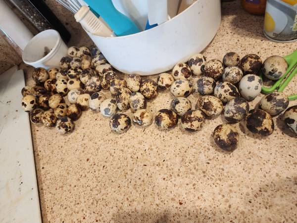 I've got too many, bring an empty egg carton or container of your choice. $5/dozen. I've got 1 male Coturnix so there's chance they'll hatch if that's what you're into. I'd be happy to leave them on...