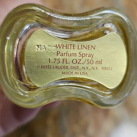White Linen Perfume Bottle with Gold Accents Elegant White Linen perfume bottle with gold accents. Perfect for any fragrance collection. 1.75 oz vintage